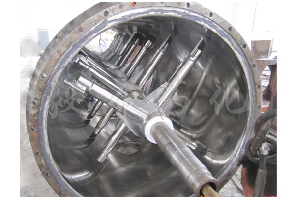真空耙式干燥机机身中间为圆柱形,器身内外分为三层,中间夹套加热介质可以是导热油循环(压力<0.3Mpa表压)或蒸汽(压力<0.3Mpa表压),外层用超细玻璃棉,保温效果很好,耗能很少,内层投放物料,特别适用于有被氧化危险的物料和热敏性物料的干燥,在干燥过程中不破坏晶体状的物料,严格限制金属离子的物料以及要求排出挥发物(或有毒物质)须回收(或有毒性)的物料,则更能显示了它的优越性。